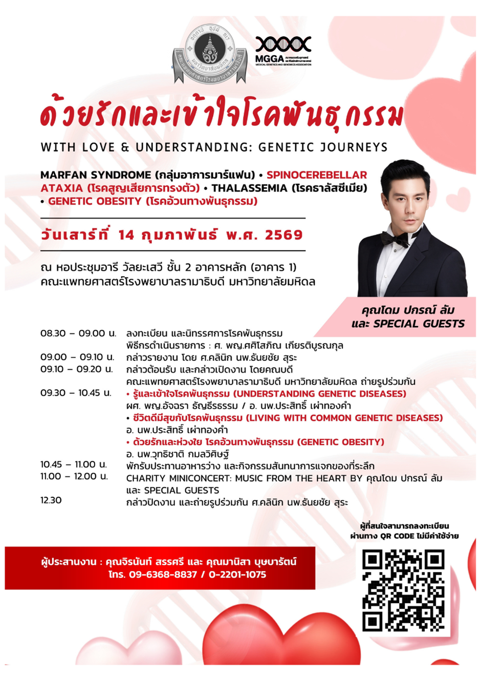 ด้วย สมาคมเวชพันธุศาสตร์ และจีโนมิกส์ทางการแพทย์ ร่วมกับ สาขาวิชาเวชพันธุศาสตร์ ภาควิชาอายุรศาสตร์ คณะแพทยศาสตร์โรงพยาบาลรามาธิบดี มหาวิทยาลัยมหิดล มีกำหนดจัดงาน "ด้วยรักและเข้าใจโรคพันธุกรรม" (With Love & Understanding: Genetic Journeys) สำหรับผู้ป่วยโรคพันธุกรรม ในวันเสาร์ที่ 14 กุมภาพันธ์ พ.ศ. 2569 ณ หอประชุมอารี วัลยะเสวี และโถงหน้าหอประชุม ชั้น 2 อาคาร 1 ระหว่างเวลา 08.30 – 12.30 น.โดยมีวัตถุประสงค์ในการให้ความรู้โรคทางพันธุกรรม แก่ผู้ป่วย ญาติ และผู้ที่สนใจในด้านการรักษาและป้องกัน รวมถึงการพบปะแลกเปลี่ยนความคิดเห็นระหว่าง ผู้ป่วย แพทย์ และบุคลากรทางการแพทย์