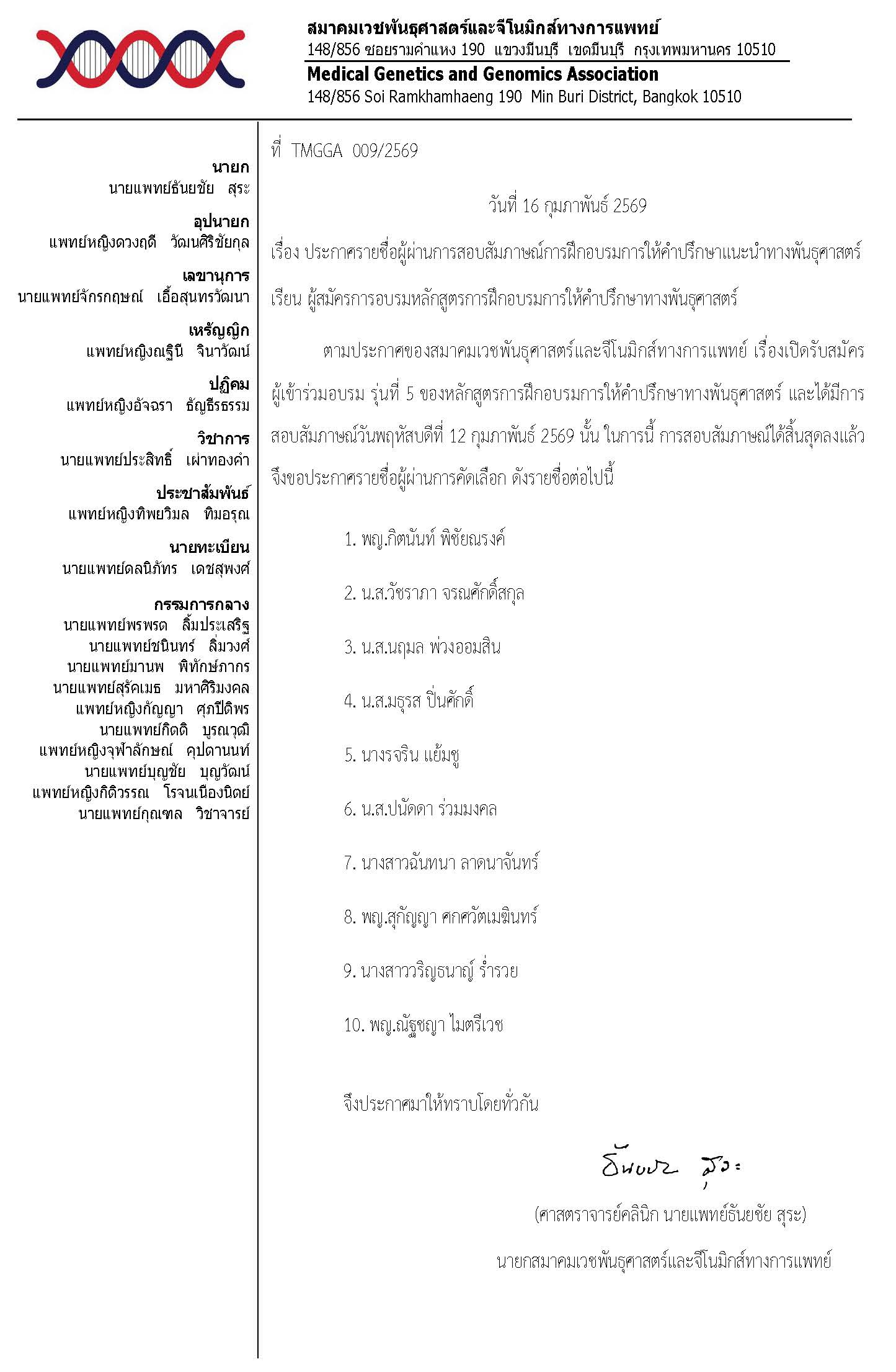 ตามประกาศของสมาคมเวชพันธุศาสตร์และจีโนมิกส์ทางการแพทย์ เรื่องเปิดรับสมัครผู้เข้าร่วมอบรม รุ่นที่ 5 ของหลักสูตรการฝึกอบรมการให้คำปรึกษาทางพันธุศาสตร์ และได้มีการสอบสัมภาษณ์วันพฤหัสบดีที่ 12 กุมภาพันธ์ 2569 นั้น ในการนี้ การสอบสัมภาษณ์ได้สิ้นสุดลงแล้ว จึงขอประกาศรายชื่อผู้ผ่านการคัดเลือก ดังรายชื่อต่อไปนี้